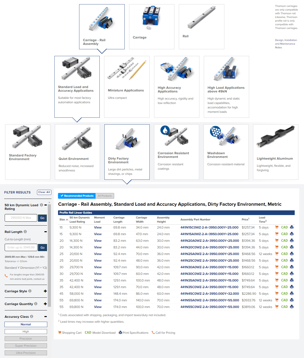 From an intuitive menu displaying the main types of profile rail linear guides, users reach a list of recommended solutions for their application in only a few clicks. They can then filter on parameters such as load, length, carriage style, accuracy and required corrosion resistance. Up-front pricing and lead times, and user-prompted live assistance are also accessible – all without leaving the original page.